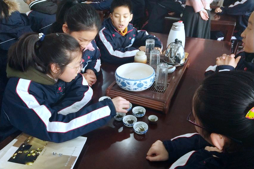 阳光透过窗帘的细缝暖暖地洒满了整个茶室,桌上一壶清亮的茶汤将阳光染成了淡绿,整个茶室也染上了茶香。我们来到这里学习茶艺,提壶、倒茶,手间尽是东方的柔美。小小的品茗杯,品的不仅是茶,更是人生的甘苦,是人生处世的从容与涵养。 ——七(6)高婧怡