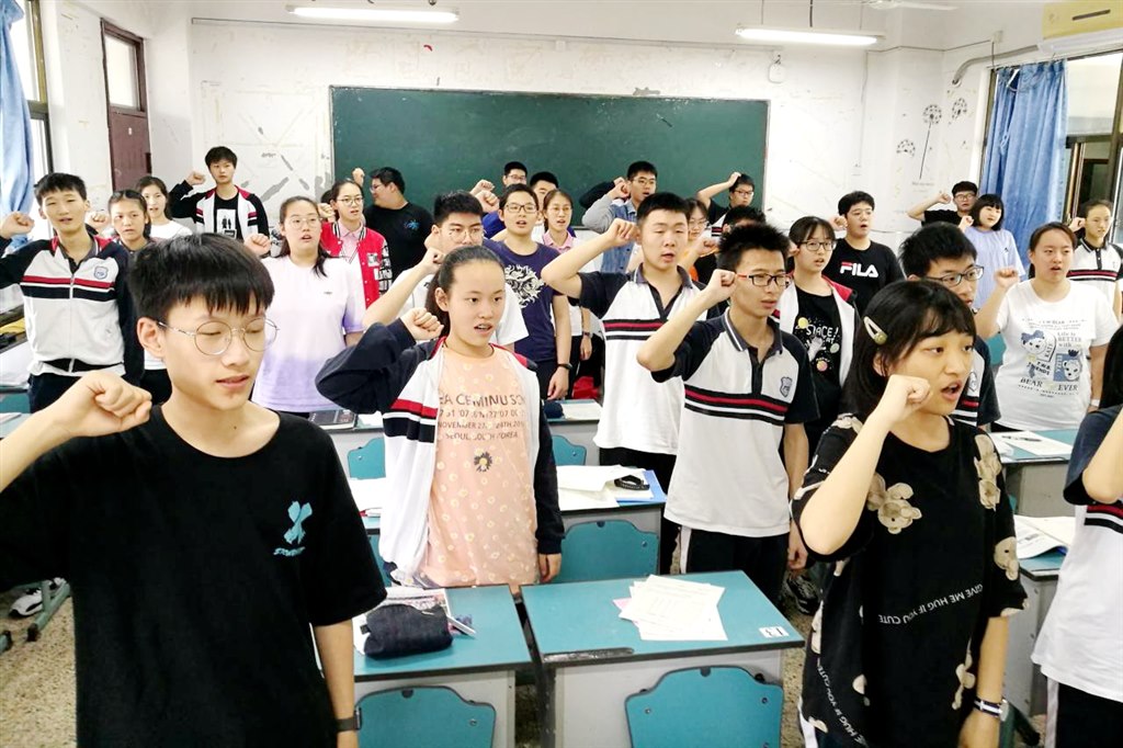 全体九年级同学激情饱满地举起右拳庄严宣誓:自觉遵守考试纪律,诚信应考,在考试中培养雅正品格,不辜负老师和家长对我们的信任。