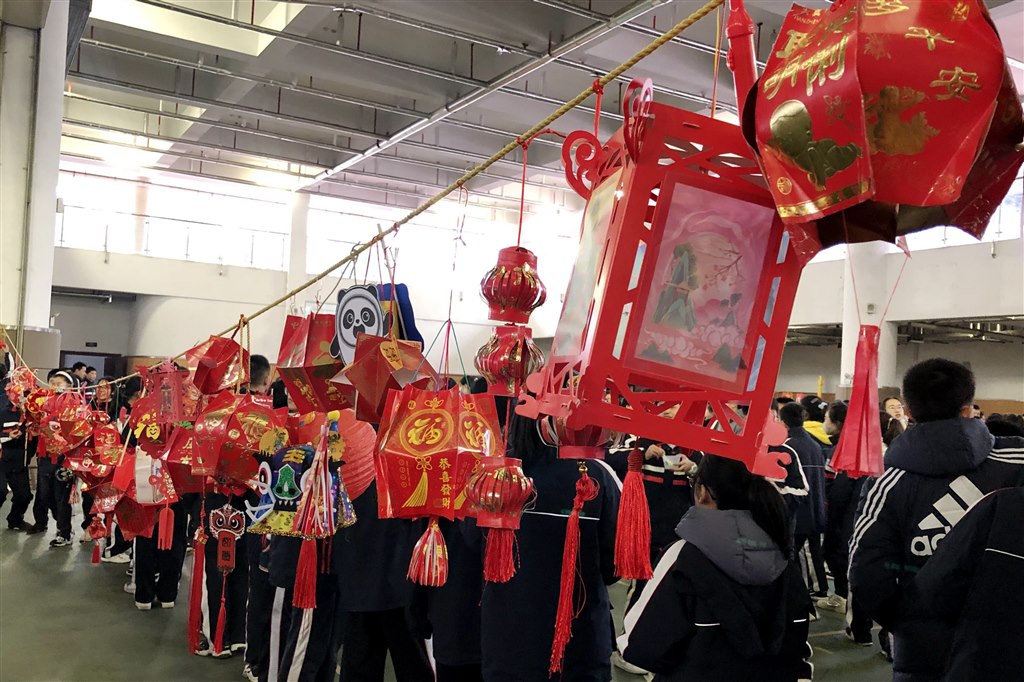 满场都挂着各式各样的灯笼,红包壳、废包装、红卡纸、塑料桶……都可以作为灯笼的原材料。看,创意手工灯笼展上,自制的雪容融灯笼、会发光的可乐灯笼吸引了同学们的目光。