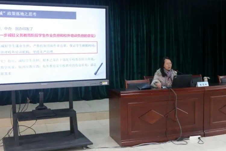 张慧群校长从两办文件《关于进一步减轻义务教育阶段学生作业负担和校外培训负担的意见》解读入手,为老师们划重点,启发思考“双减”政策下学校如何发挥主阵地作用,积极应对新挑战。并从系统推进、价值引领、行动赋能、提升“四会能力”及和雅管理等多维度进行具体引领。在课堂教学方面,张校长指出:教师的价值在课堂,教育的质量靠课堂的理念,结合二十四中省级课题组“重构课堂模型”、“迭代升级学科课程群”的行动作诠释。分享了强化作业管理、提升作业质量的实践举措,以及课后服务的育人经验,为“双减”后的教育教学工作指明了方向,并指出在“双减”的大背景下,应促进家校形成合力,携手互助,共育学生。