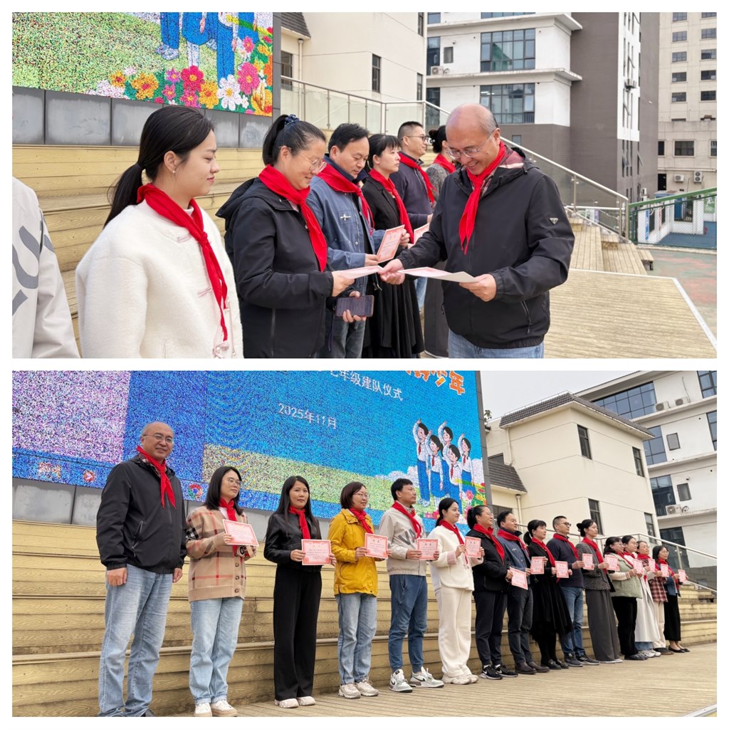 各班中队长为中队辅导员佩戴红领巾,校党总支张洪书记为各中队辅导员颁发聘书。