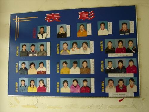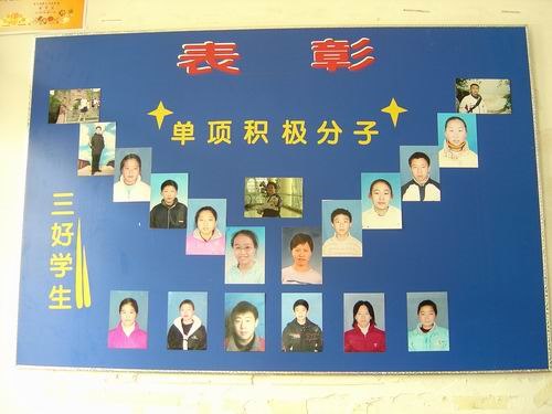 另外,每个班级西面墙上都挂有荣誉榜,深蓝色的底板,沉稳而又庄重,各班在上面贴出了在上学期中各单项标兵与三好学生的照片,它不仅激励着榜上有名的同学再接再厉,也让其他的同学充满了上进心与斗志,向着目标更加努力!