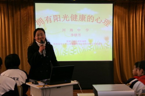 为了贯彻落实《常州市中小学生命教育指导意见》精神,积极开展2010年中小学生命教育周活动,常州市河海中学继本周一上午的生命教育周启动仪式后,又于03月17日下午开设了《拥有阳光健康的心理》专题讲座,由国家二级心理咨询师、常州市中小学心理健康教育赵世俊名师工作室成员、我校李锁芳老师主讲。