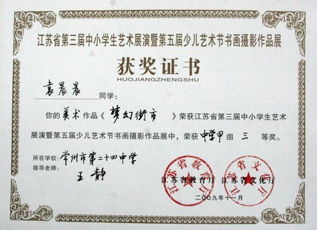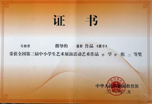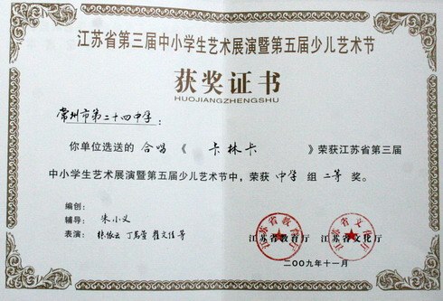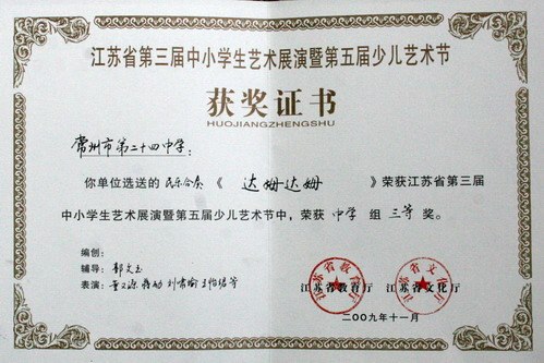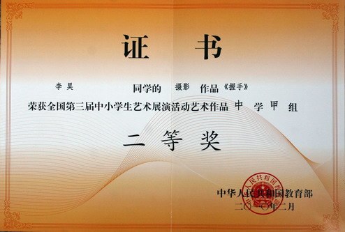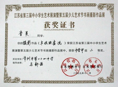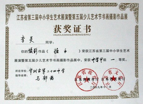 2010年3月,在上海东方艺术中心落下帷幕的以“阳光下成长”为主题的全国中小学艺术节展演活动中,常州市第二十四中学九(9)班李昊同学的摄影作品《握手》荣获全国第三届中小学生艺术展演活动艺术作品中学甲组二等奖。