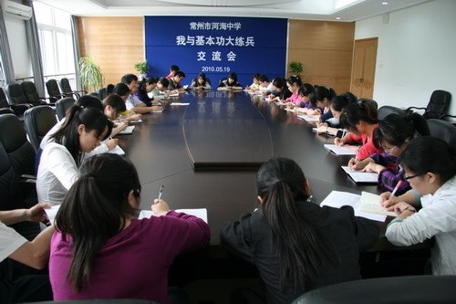 河海中学青年教师占一定比例,都要参加此次基本功大练兵,因此学校对此非常重视,每位青年教师也对此有深刻的认识和积极的行动,会上青年教师们结合前期准备和体会踊跃发言。例如葛娟萍老师分别从提高课堂效率,改进作业点评方法和增强学科解题能力来谈了自己的一些做法和心得;毛叶老师则是更进一步得领会了基本功大练兵的精神实质,认为这是一次对青年教师的考验和锻炼,应在平时的教学过程中及时发现和弥补自身的不足,来更好地展示自身的优势;査雪寒老师主要讲述了自己如何夯实专业知识,提高专业素养、改进教学方法和提高教学质量等方面的做法。其他多位青年教师也畅谈了自己在这两个月中对于大练兵的思想认识和实际行动,气氛非常热烈。