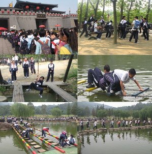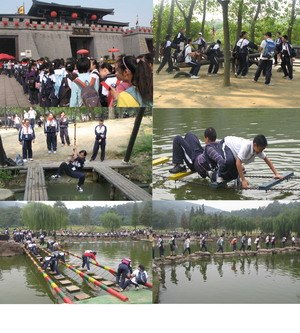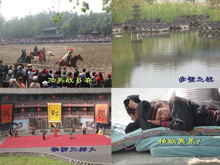 三国城坐落在葱茏苍翠的军嶂山麓、风景秀丽的太湖之滨,这里依山傍水,令人心旷神怡。首先,大家观看了大型情景剧《三英战吕布》,激动人心的表演、精彩绝伦的特技,让同学们纷纷感叹,台上一分钟台下十年功啊!随后,同学们还观看了《华夏古韵》、《桃园三结义》、《煮酒论英雄》等一系列大型情景剧的表演,游览参观了“火烧赤壁”、 “吴王宫”、“甘露寺”、“曹营水旱寨”、“吴营”、“七星坛”、“跑马场”、“点将台”等几十处大型景点。一下子同学们好像回到了一千八百多年前古战场,回到了那硝烟弥漫、烽火四起、群雄逐鹿的年代;回到了那至今仍让人津津乐道的英雄事迹的年代;回到了那民不聊生、居无定所、战事连连的年代。谁才能救万民于水火?