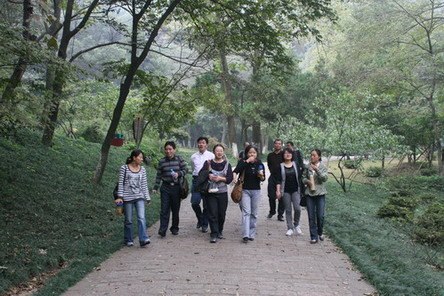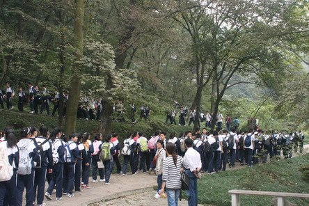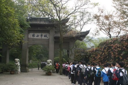 从招隐坊往上走,同学们分别游览了虎跑泉、昭明太子读书台等胜迹,进到山里,幽深极了,真是读书的绝佳去处,满眼见到的尽是错杂葱郁的树林,置身里面,真想捧书坐于亭间,与婉转鸟鸣和徐徐清风为伴,摇头晃脑陶醉在青山泉流之中。