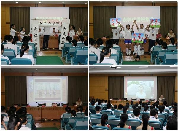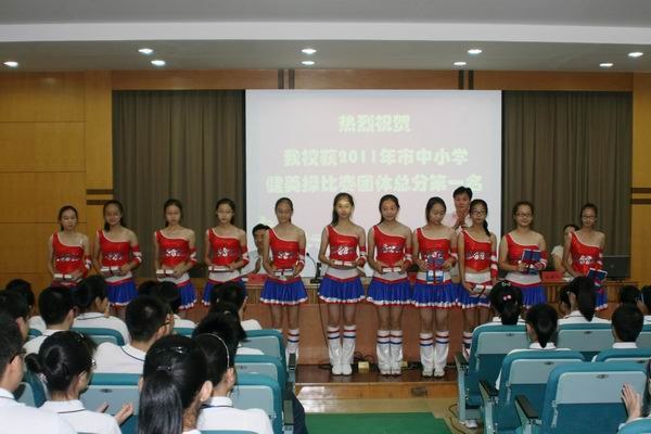 首先表彰了上学期的优秀班集体,他们团结奋进,积极进取,各班代表上台集中展示了本班的风采,和大家一起分享了他们的喜悦。紧接着大屏幕展示了学校艺术体操队的亮丽风采,她们在烈日炎炎的夏日里,为了学校的荣誉挥洒着汗水与激情,在暑假2011年常州市中小学生健美操比赛中,团结一心、努力拼搏,以新颖独特的造型、高难度的队形变换、丰富动感的表演,勇夺初中组第一名,这是学校近十年来获得的最好成绩。