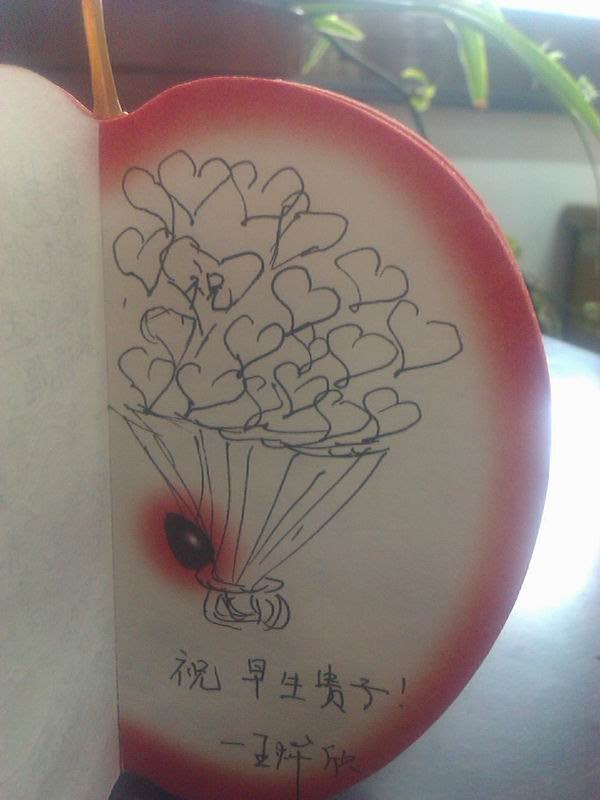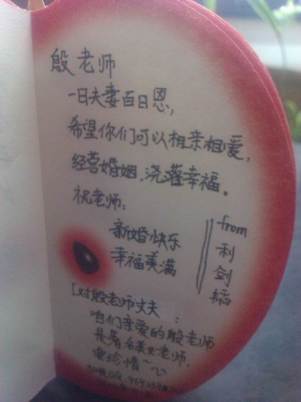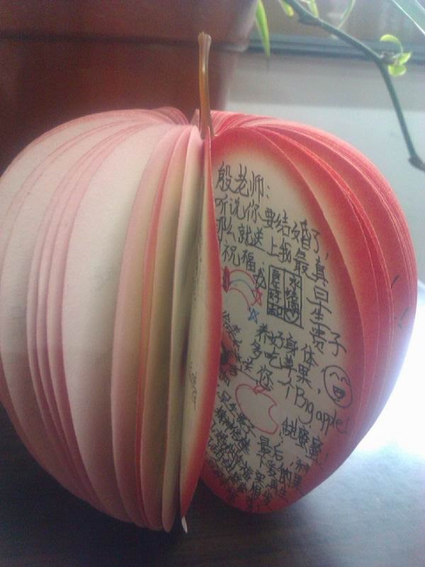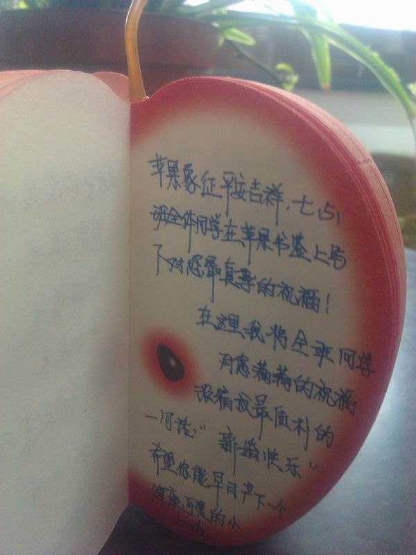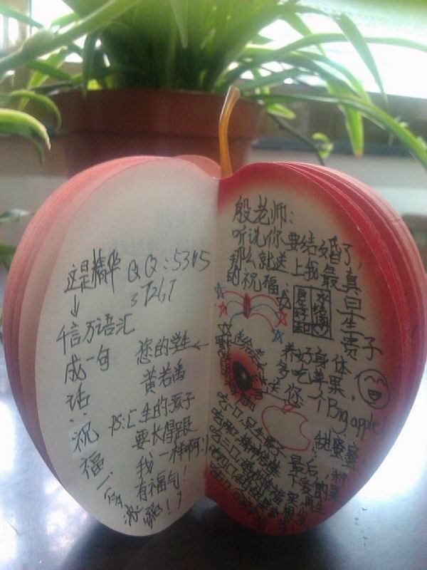 班主任许老师拿来了一个“苹果”,把我们都给愣住了,老师葫芦里卖的到底是什么药?许老师得意地告诉我们:“苹果象征着平平安安,我们把对殷老师的祝福写在苹果上,可以让殷老师永久保存啊。”许老师这个颇有创意的点子,赢得了大家的一致认可。写点什么呢?教室里顿时安静下来,大家都在认真构思呢!“苹果”从同学们手上一个个传过,一句句饱含真情的话语映入我的眼帘:“结婚要hold住啊,做最美丽的新娘!”“婚纱照借我们欣赏一下下吧。”“一日夫妻百日恩,希望你们可以相亲相爱,经营婚姻,浇灌幸福。”“听说您要结婚了,新郎长什么样?透露一下,让我看看谁能入得美女老师的法眼。”“期待殷老师早生贵子”……“咱们亲爱的殷老师可是著名的美女老师,要加倍珍惜哦。”居然还有同学充当“娘家人”,对殷老师的老公提出了“要求”。可见,殷老师在我们心目中的分量,那绝对是“死党”级别的哦。