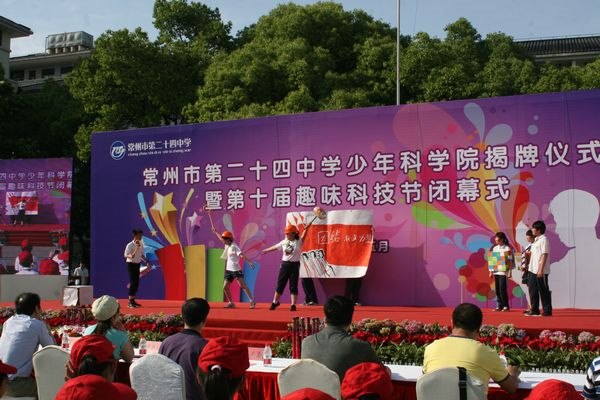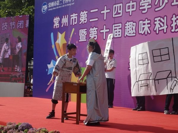 科技节闭幕式上,24中的小科幻迷们演绎的未来科幻生活,可是赚足了观众的眼球。八(5)班的同学们以普通的学习生活为基础,想象出了未来的教学模式:全景体验模式。随着魔方的旋转,把主人公带到了2224年的二十四中学,展开了一段神奇的旅程。主人公体验了一把未来的教学:全景体验模式,即学习者可以亲临所学内容的情境中,在体验中学习。第一幕是语文课,演绎的是初中语文课文《孔乙己》中的一幕,主人公亲临咸亨酒店,扮演起了孔乙己,幽默的对白中添加了不少现代元素,既贴近同学们的现代生活,又很好的与未来学习结合在一起,而夸张生动的动作更是这个表演中的又一个精彩之处。第二幕是历史课,主人公来到了1958年大跃进年代,这次体验的是大炼钢铁的工人,在“团结就是力量”的音乐背景中,几个炼钢工人拿着“锤子”走上舞台,那雄赳赳气昂昂的神情演绎得惟妙惟肖。赢得下面掌声一片。而最后一幕,则更是出人意料,主人公提出要求,说想看看2013年的中考答案,这时间机器播出了通知:回到2012。主人公时间机器匆匆拉下了台,最后还嘟囔着:“我的中考答案……”引起一阵台下阵阵笑声。是啊,想要不劳而获的后果永远是自讨苦吃,一切要靠自己努力才行啊。