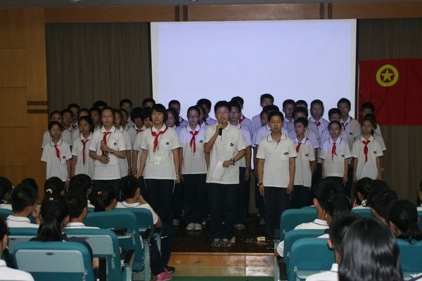 同学们唱响了最后一次少年先锋队队歌,大队辅导员沈天姿老师宣布全体学生正式离队。快乐的童年已经远去,拼搏的时代正一步步走近。在神圣的团旗下,各班新团员庄严宣誓,成为光荣的共青团员。